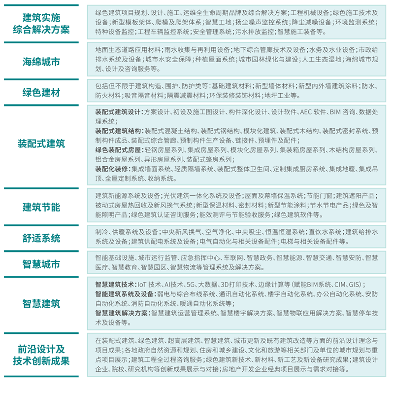 携手中建八局、上海建工、华为、清华同方等行业百强企业,汇聚绿色、智能建筑全产业链企业,汇集相关行业终端用户,将设专区展示项目设计、施工、运维一体化全生命周期综合解决方案,聚焦绿色+智慧+工业化集成建筑新趋势,定义建筑产业市场的发展方向。