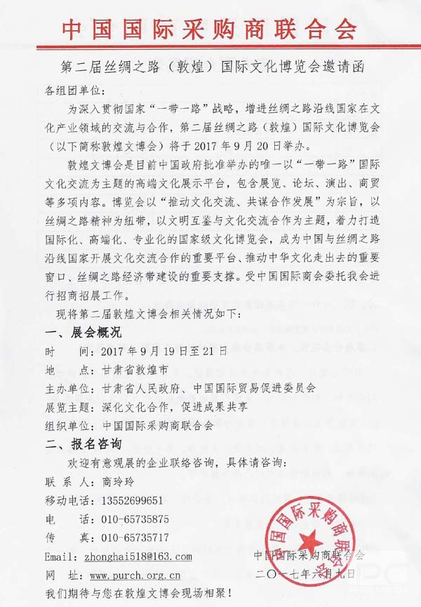促进“一带一路”地区经贸交流,共谋文化产业合作发展,对于我市文化产业的国际化发展意义重大。下述“第二届丝绸之路(敦煌)国际文化博览会”由兄弟商协会组织承办,对参展企业和专业观众提供了很多实际支持,有意向的企业可以详细阅读文件内容,直接向文件中的联系人咨询、报名。本次活动由中国国际采购商联合会组织。