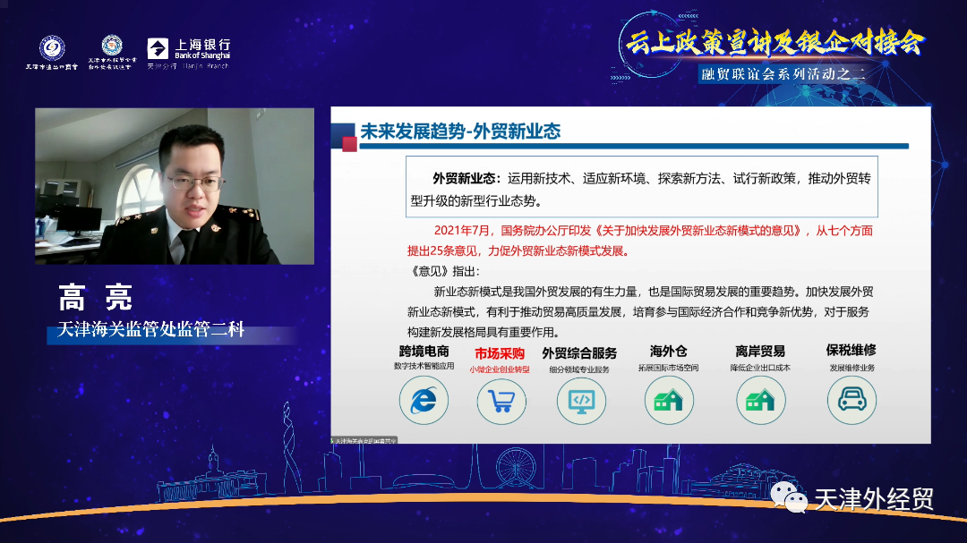 外促会“融贸联谊会”系列活动之二“云上政策宣讲会和银企对接会”成功举办。本次活动是“融贸联谊会”成立以来的本年度第二次活动,活动由两会和上海银行天津分行主办,得到了
