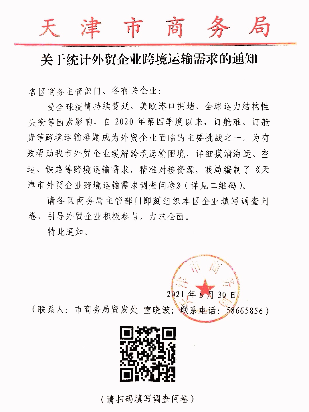 为有效帮助我市外贸企业缓解跨境运输困境,摸清跨境运输需求,精准对接资源,市商务局近期下发《关于统计外贸企业跨境运输需求的通知》,请各会员单位及相关企业积极填写调查问卷(扫描文件中二维码即可填报)。