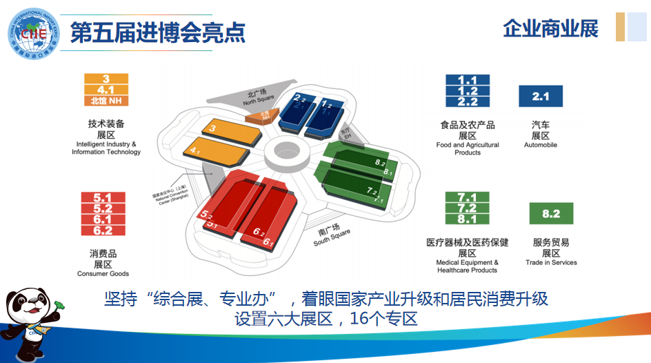 第五届进博会总体方案将延续前四届总体架构。其中企业商业展规划面积36万平方米,分为食品及农产品、汽车、技术装备、消费品、医疗器械及医药保健、服务贸易六大展区。